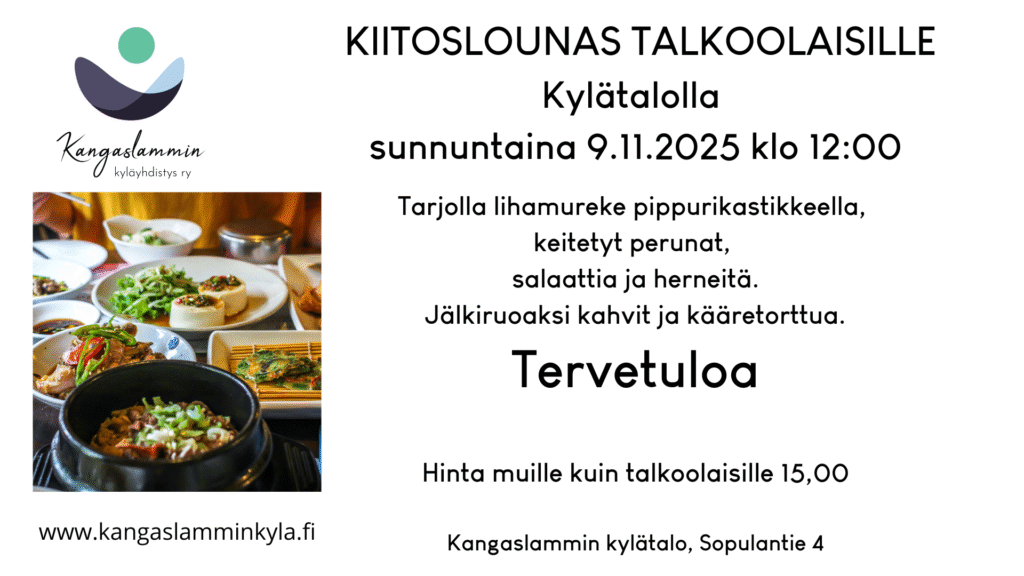 Kiitoslounas talkoolaisille sunnuntaina 9.11.2025 klo 12.00