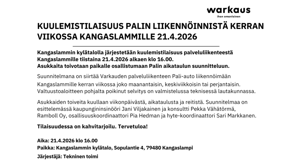 Kuulemistilaisuus Palin liikennöinnistä Kangaslammilla 21.4-2026 klo 16.00